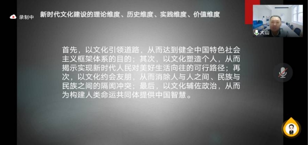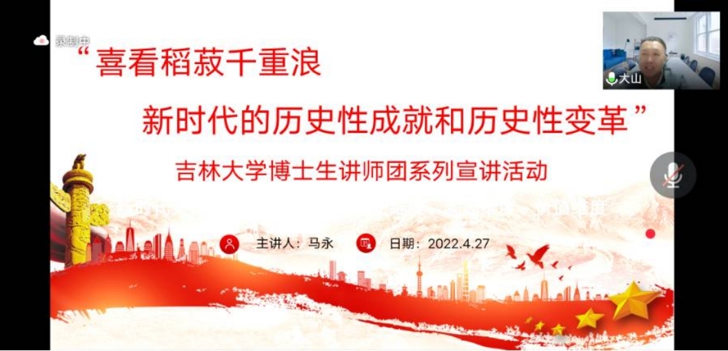 组织全体研究生观看了“喜看稻菽千层浪——新时代的历史性成就和历史性变革”的吉大博士生讲师团线上宣讲系列活动讲座第七讲,由吉林大学哲学社会学院2021级博士研究生马永博士主讲的以《新时代关于文化建设的历史成就》为主题的相关报告。