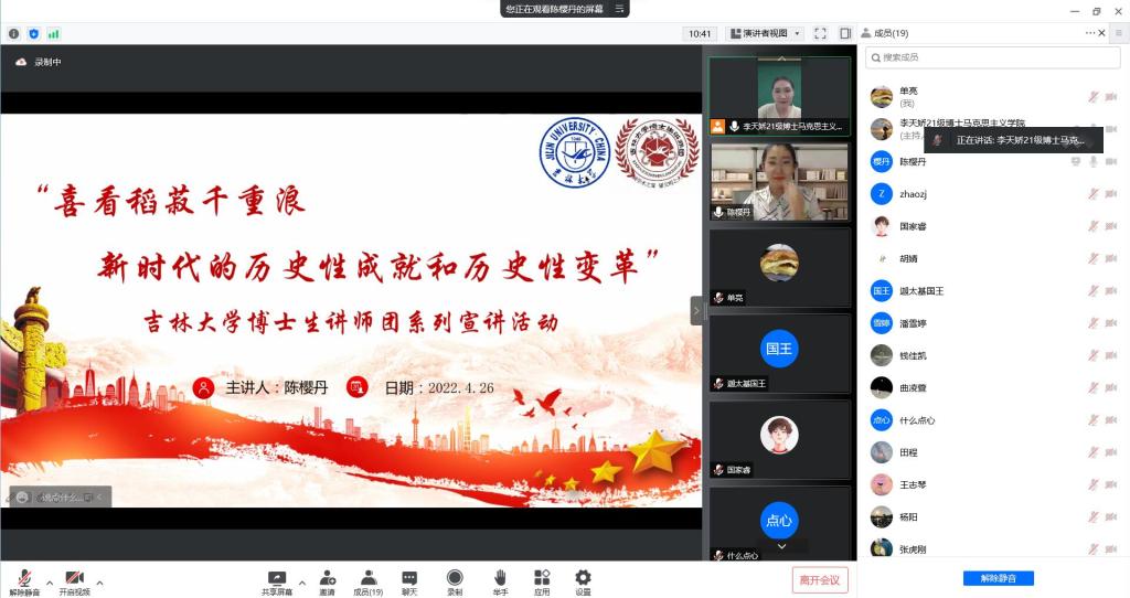 组织全体研究生观看了“喜看稻菽千层浪——新时代的历史性成就和历史性变革”的吉大博士生讲师团线上宣讲系列活动讲座第六讲,由吉林大学马克思主义学院2021级博士研究生陈樱丹博士主讲的以《以法治为笔以使命为墨,共同书写新时代全面依法治国新篇章》为主题的相关报告。