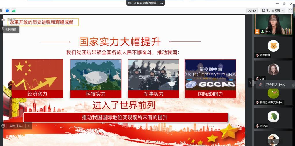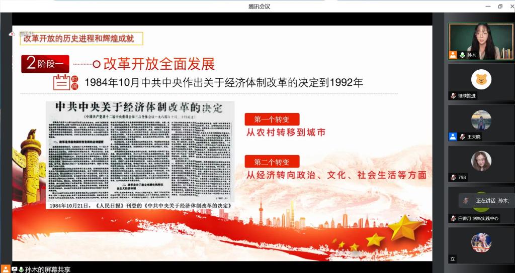 组织全体研究生观看了“喜看稻菽千层浪——新时代的历史性成就和历史性变革”的吉大博士生讲师团线上宣讲系列活动讲座第四讲。吉林大学马克思主义学院2021级博士研究生孙木博士以《新时代关于全面深化改革开放的伟大成就》为题,向我们详细讲述了改革开放至今,我国取得的系列伟大成就。