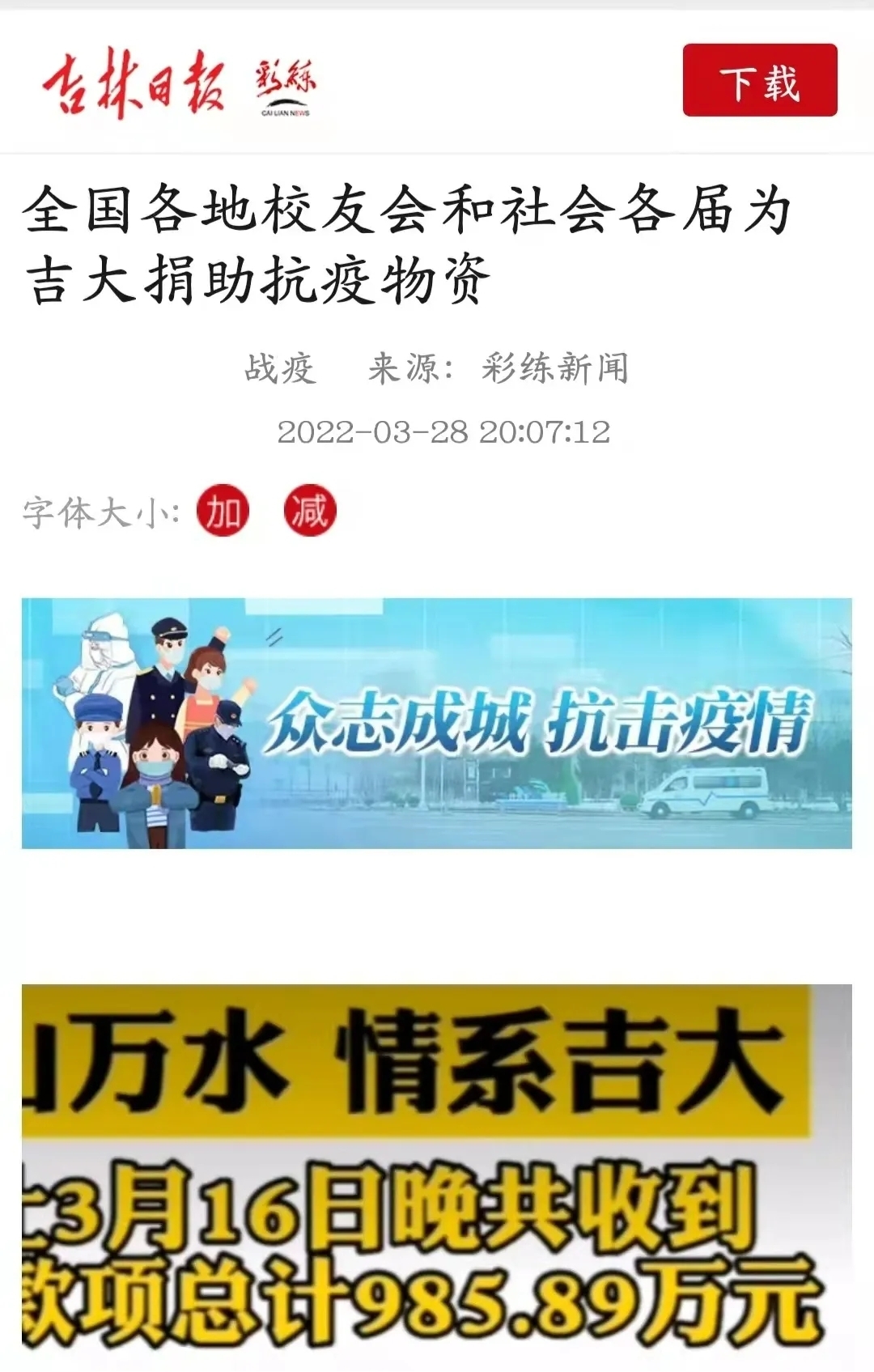 一方有难,八方支援,在疫情期间着实感受着这句话的温暖。2020年新春伊始,祖国各地支援武汉;2022年春寒料峭,吉林省也迎来全国各省的支援。随着吉林疫情愈发严重,各地医护人员、建筑工人等火速前往长春帮助患者救治、核酸检测、方舱搭建等,大量防疫物资如口罩、防护服、酒精等也通过各种途径、渠道运往长春。不仅如此,吉林大学也发动社会各界人士通过吉林大学校友会及长春市红十字会进行捐款。捐款发起后,看到朋友圈里已经毕业的师兄师姐纷纷贡献自己的一份绵薄之力,看到微博中身处各行各业的校友们尽其所能帮助母校度过难关,深有感触,这就是吉大人的吉大精神吧。