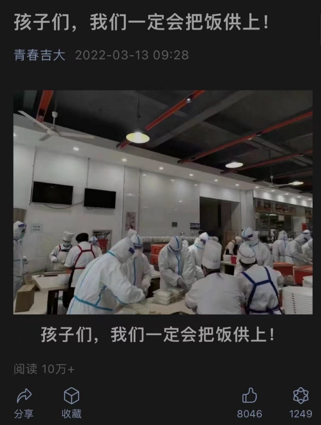 还记得那篇只有一张图片的推文吗?吉林大学官方公众号发布发的那则《孩子们,我们一定会把饭供上!》中,头戴厨师帽的叔叔阿姨和穿着防护服的工作人员,正在食堂里紧锣密鼓地打包饭菜,由志愿者向各公寓楼的在校生送来三餐。万事开头难,总会遇到各式各样的问题,但学院进行了积极的意见反馈工作,及时了解各公寓楼的实际状况和学生诉求,及时调整,让大家都吃上了学校辛苦提供的热腾腾的饭菜。还有同学打趣说:“以为的隔离生活——没什么可吃的;真实的隔离生活——猪羔子都不敢这么养。”“什么家庭啊一顿四个菜,还带酸奶水果的,解封之日怕不是出栏之时。”每天4万份且能够按时送到每位同学手中的隔离餐,营养丰富又美味;宿舍里随之升腾起来的热气和饭香,都是一个高校对学生最真挚的爱护。