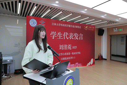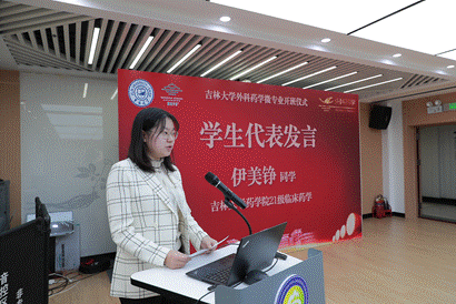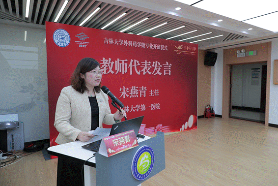 教师及学生代表发言|外科药学微专业负责人宋燕青老师代表教师团队进行发言,介绍了建设外科药学微专业的初衷是打通“患者治疗”与“指南推荐”的最后“一公里”距离,实现以临床需求为导向、学科建设为靶标、人才培养为目的的目标。外科药学微专业首届学员、吉林大学 21 级临床药学专业的伊美铮同学和吉林大学白求恩第一临床医学院 22 级临床医学 5+3 专业的刘洺菀同学分别代表临床药学和临床医学学生发言,从药学生和医学生的不同视角表达了对外科药学微专业学习的认识,期待通过外科药学丰富多样的课程,夯实自己的专业底蕴,实现医学梦想。