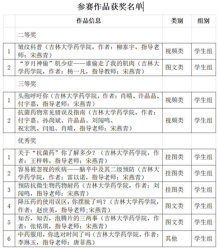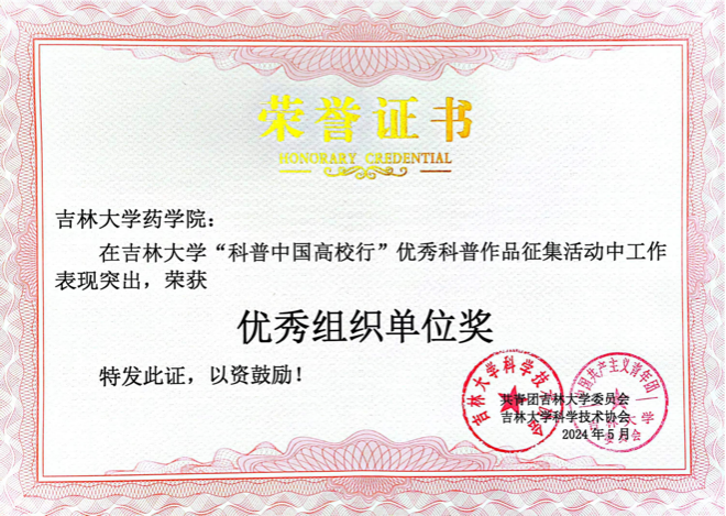 为推进科普人才培养与科普中国建设,吉林大学科学技术协会举办了“科普中国高校行优秀作品征集暨2024校园科普创作大赛”活动。在此次大赛中,我院学子表现优异,共获得多个奖项,展现了药学科普创作的独特魅力。