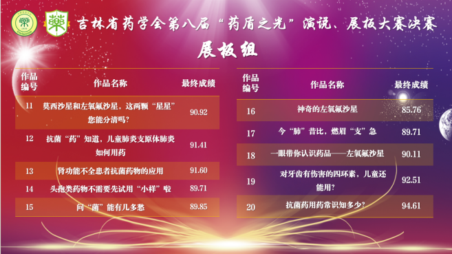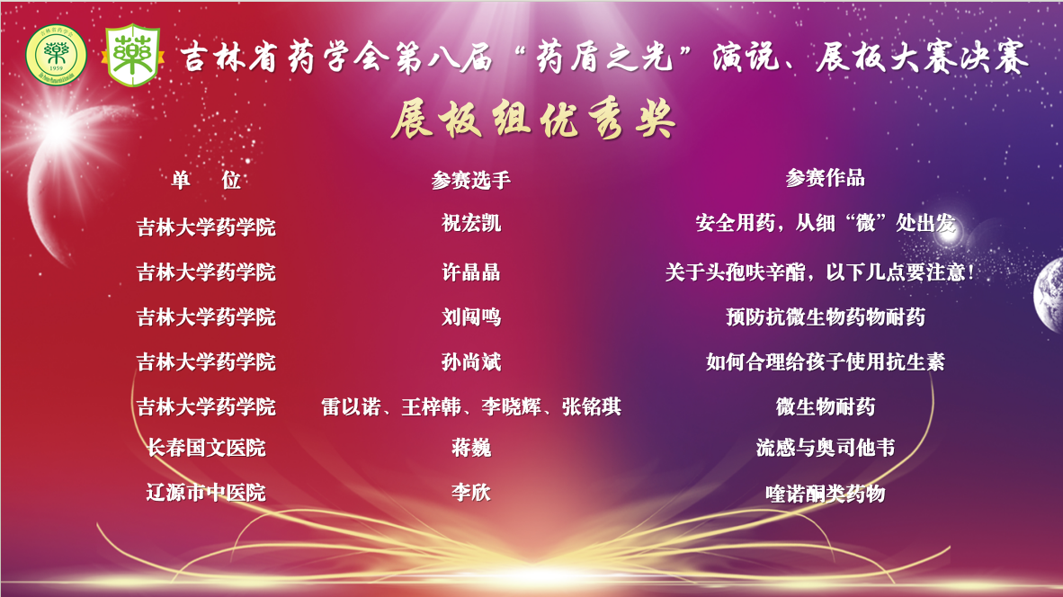 由吉林省药学会主办,吉林省药学会科学传播专业委员会、吉林大学第一医院承办的“吉林省药学会第八届‘药盾之光’演说、展板大赛”决赛于 2023 年11月22日在长春拉开序幕。本次大赛作为我国“提高抗微生物药物认识周”的一项重点活动,以“抗微生物药物合理使用”为主题,共有来自全省22家医疗机构和院校参与。