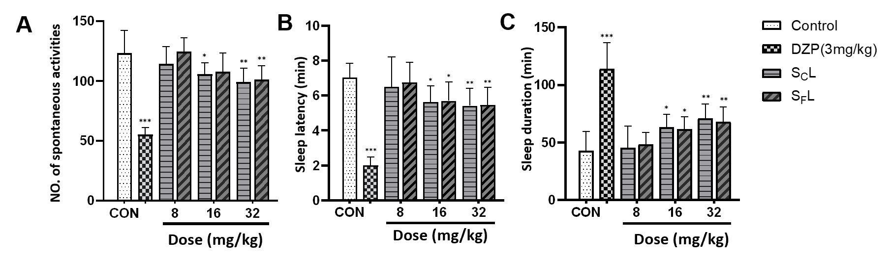 图2 SCL和SFL对小鼠自发活动数(A)、戊巴比妥催眠诱导小鼠睡眠潜伏期(B)和持续时间(C)的影响(与对照组比较,*p< 0.05,**p< 0.01,***p< 0.001;与模型组比较,#p< 0.05,##p< 0.01,###p< 0.001)